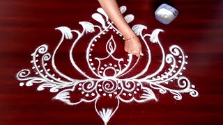 Simple Lotus Flower And Deepam Rangoli Designs With 5 Dots